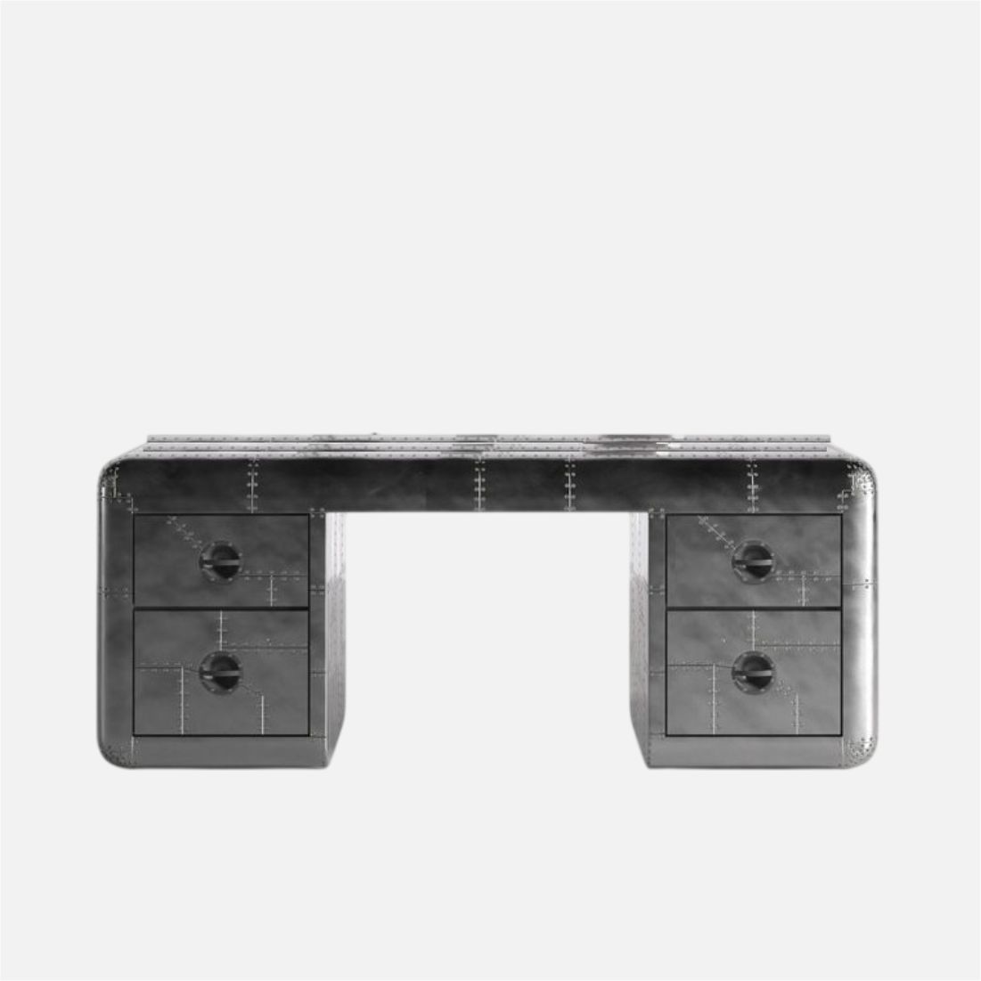 Upgrade your workspace with the Aviator Executive Desk, crafted with a bold aluminum-clad finish inspired by vintage aircraft design. Featuring smooth riveted detailing and four spacious drawers, this desk is both stylish and practical. Its industrial-modern look makes it perfect for home offices, executive suites, or creative studios. Strong, durable, and designed to stand out, the Aviator Executive Desk brings timeless aviation heritage into your workspace while providing maximum organization and functionality.