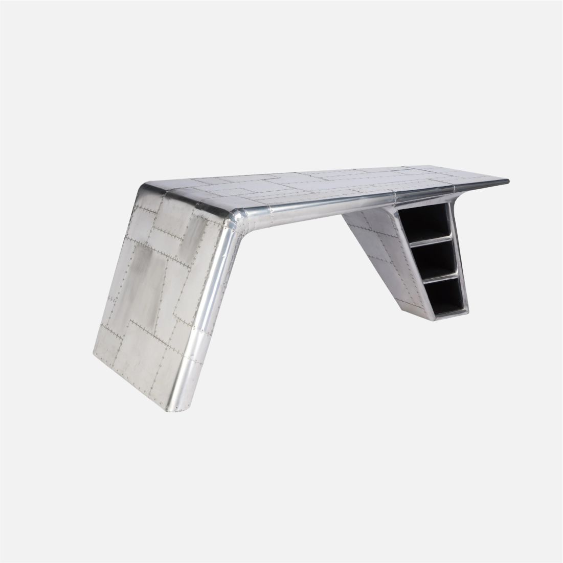 The Aviator Wing Desk with Shelves brings together aviation-inspired design and practical functionality. Crafted with hand-polished aluminum panels and riveted detailing, this desk echoes the raw beauty of vintage aircraft wings. Its bold silhouette and clean industrial lines make it an eye-catching addition to any office, loft, or creative studio. Equipped with open side shelving, it provides practical storage for books, files, or display pieces while maintaining a minimalist, uncluttered aesthetic. The aluminum finish is durable and easy to maintain, ensuring lasting appeal. Perfect for professionals, designers, and executives who appreciate a blend of heritage craftsmanship and modern usability, the Aviator Wing Desk is more than furniture—it’s a work of art. Place it in a contemporary home office, aviation-themed space, or corporate setting to make a strong design statement while enjoying everyday functionality.