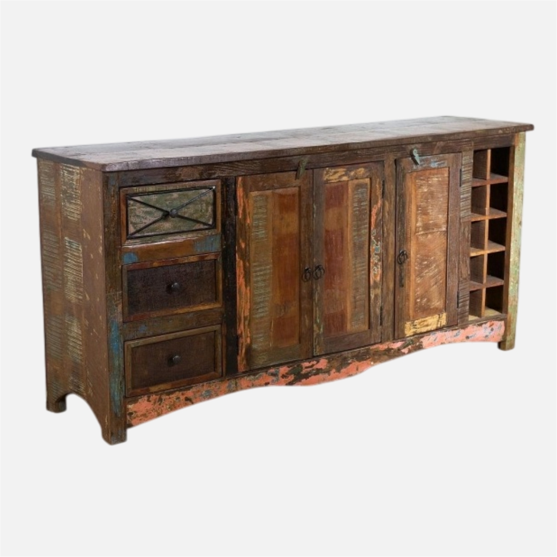 This reclaimed wood sideboard with wine rack is a stylish and practical addition to any dining or living space. Expertly handcrafted, it features multiple storage options including drawers, cabinets, and a dedicated wine rack, making it perfect for organizing dinnerware, cutlery, and your favorite bottles. The distressed multicolor finish highlights earthy tones with hints of turquoise and coral, creating a patchwork effect that brings rustic charm to your décor. Made from sustainably sourced reclaimed timber, this sideboard is not only durable but also eco-conscious. Each piece tells a story through its natural imperfections and unique textures, ensuring no two are alike. Its robust construction and versatile design make it suitable for rustic, farmhouse, industrial, and bohemian interiors. Beyond storage, it serves as a decorative focal point that enhances your space with character and authenticity. Elevate your home with this timeless sideboard that blends function, sustainability, and artistry.